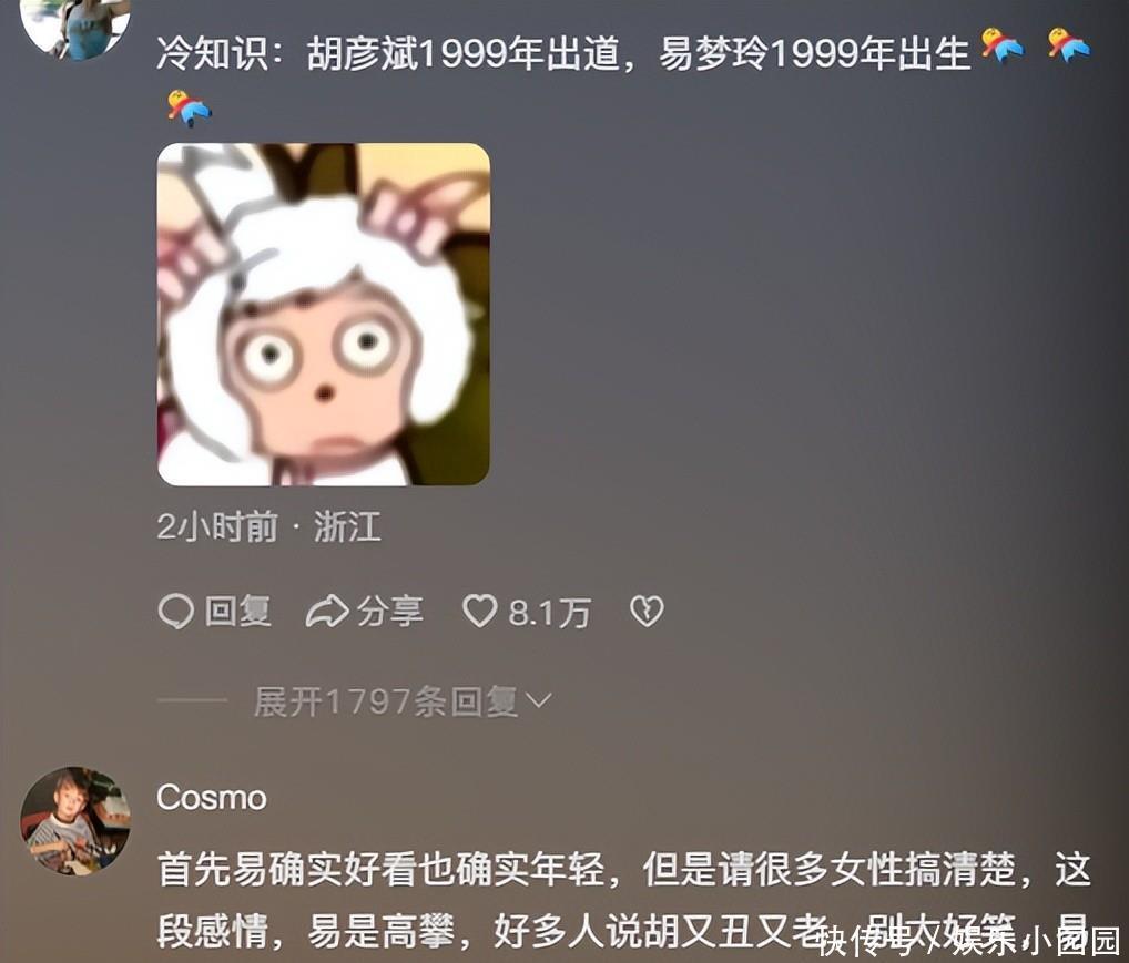 还有人说,在这段感情中,不是胡彦斌老牛吃嫩草,而是易梦玲高攀了。因为易梦玲只是一个小模特小网红,而胡彦斌却是顶流男歌手,双方的社会地位、经济条件相差悬殊,而且人家胡彦斌的前女友可是一线女明星啊!对此,大家怎么看呢?